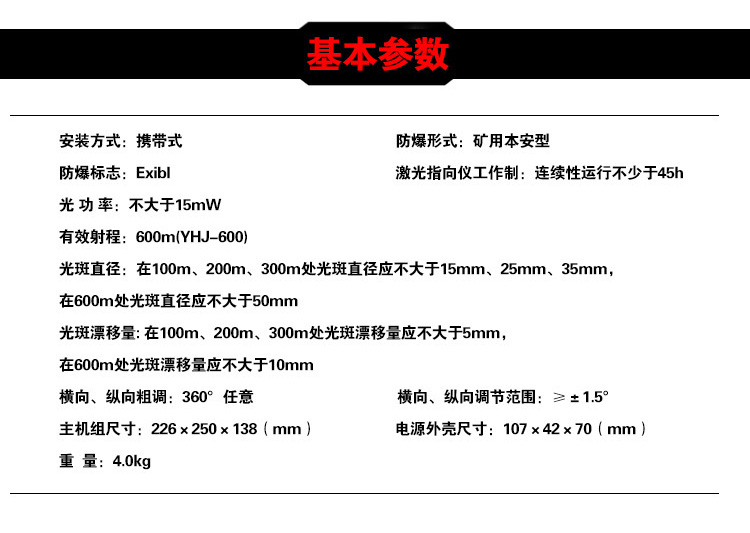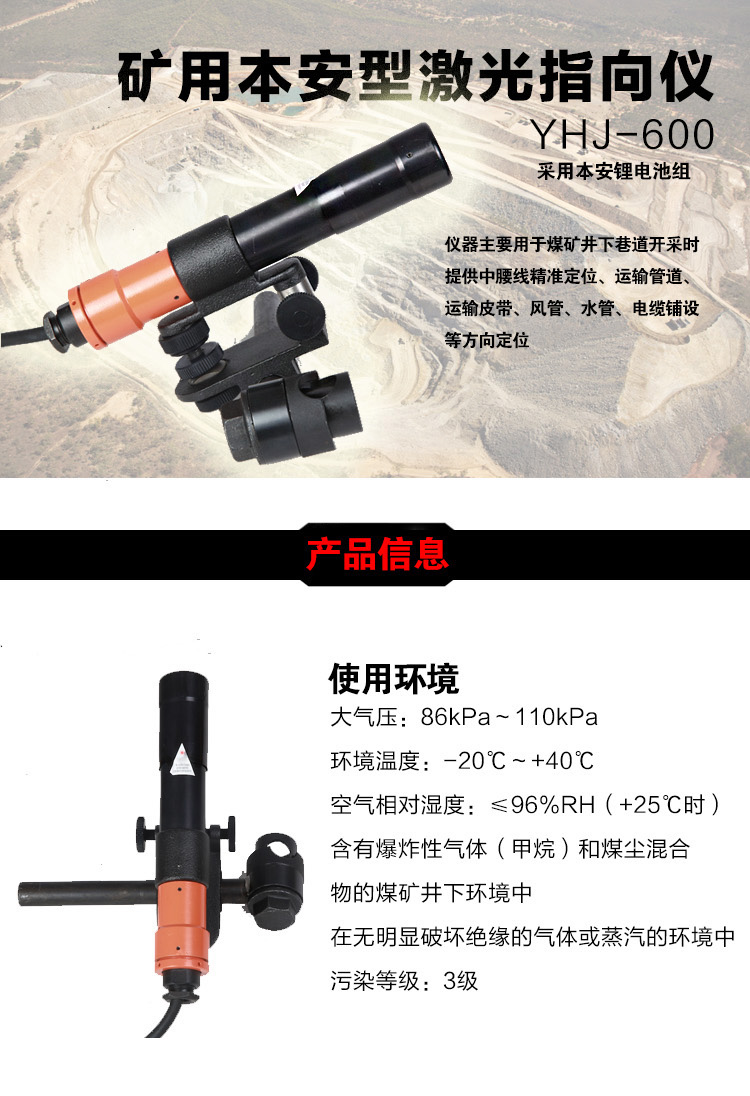 YHJ矿用本安型激光指向仪是集电子、光学、精密机械等技术为一体的仪器。具有外形美观、体积小、重量轻、防爆等特点。仪器通过悬挂组可快速固定在锚杆上,可在360°范围任意粗调,微调准确;调节方便,制动可靠。产品采用自主研发的光学系统,可采用红、绿两种光源,光斑大小、射程满足矿下施工需求。产品配用DC3.6V LH400-D61HC3BRL电源组,不需要在现场接入其他电源,可使仪器广泛用于无交流电源厂