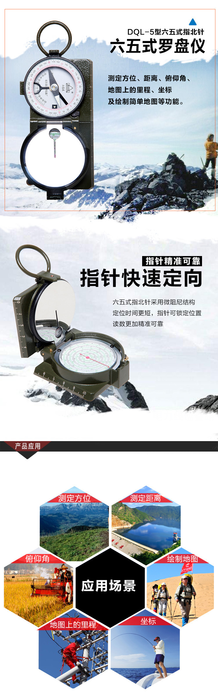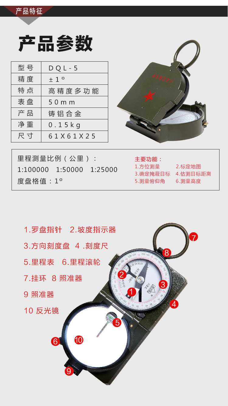 DQL-5型六五式指北针测定方位、距离、俯仰角、地图上的里程、坐标及绘制简单地图等功能。